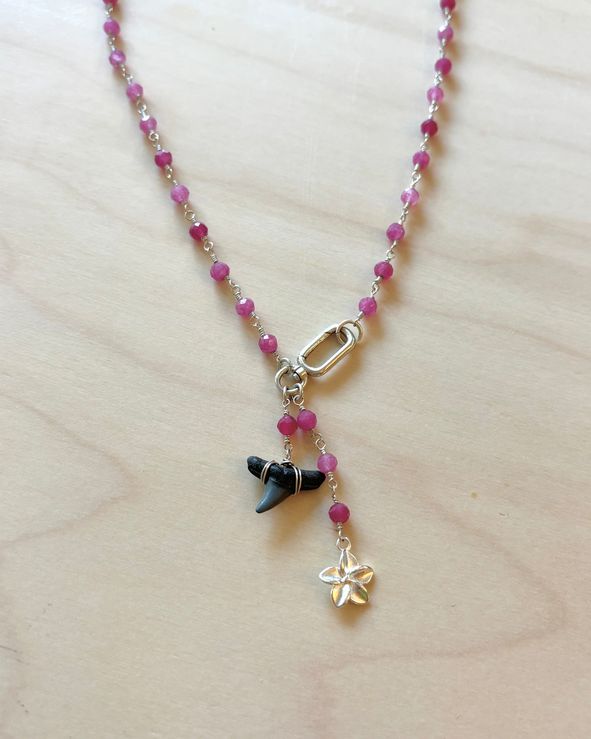 • Material: sterling sliver - wire, charm and findings, pink tourmaline, amethyst or moonstone - gemstone beads, sharks teeth - hand collected in south Florida